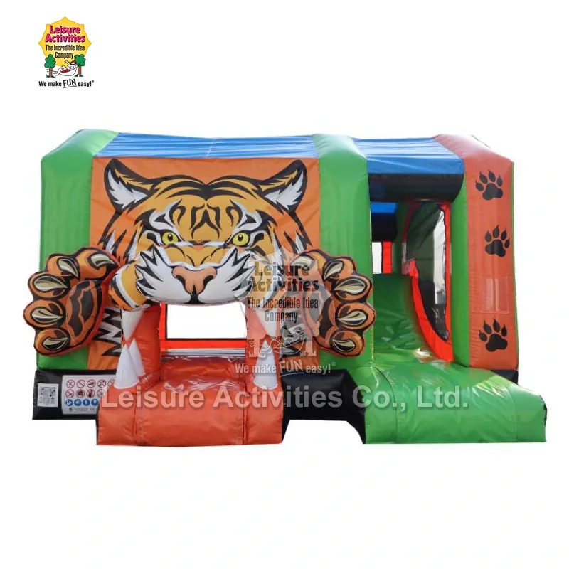 Leisure Activities® ialah pengilang profesional dan pembekal produk kembung di China. Standard Inflatable Multiplay Tiger Bouncy Castles ialah istana kembung bertemakan harimau yang menggabungkan ciri melompat, memanjat dan gelongsor. Ia menampilkan warna hijau limau dan oren sebagai warna utama, dengan hiasan harimau 3D di pintu masuk. Ia boleh disediakan dengan cepat dalam masa 10 minit sahaja.